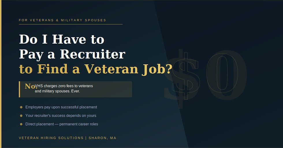 No. VHS charges zero fees to veterans and military spouses at any stage of the process — sourcing, screening, interview prep, or placement. Our fees are paid exclusively by employer clients upon successful placement.